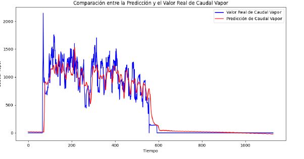 La solución no solo mejora la operación de la caldera, sino que incorpora una capa analítica avanzada. Se ha desarrollado y validado un modelo de predicción de producción de vapor con cinco minutos de antelación usando redes neuronales LSTM, porque este tipo de redes se adapta bien a series temporales industriales y a cambios de carga.
